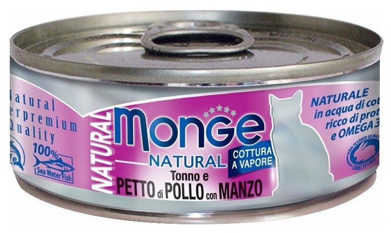 Дополнительное питание для взрослых кошек - консервы с кусочками тунца, курицы и говядины. Настоящий деликатес для четвероногих гурманов из линейки Monge Natural приготовлен на основе тунца, являющегося источником белка высокой пищевой ценности. В состав консервов входит исключительно филейная вырезка и рис. Продукт обогащен витамином Е и ФОС и не содержит искуственные добавки, красители, консерванты, глютен и субпродукты.Сырой белок 18%, сырые жиры 1%, сырая клетчатка 0,5%, сырая зола 1%, влажность 79%. Энергетическая ценность: 825 ккал/кг.Тунец 45%, курица 26%,говядина 5%, рис 1%, фруктоолигосахариды (ФОС). Пищевые добавки/кг: витамин Е (альфа-токоферол) 50 мг.Подавать корм комнатной температуры или подогретый. Важно, чтобы животное всегда имело доступ к чистой, свежей воде. Кошкам средних размеров необходимо 4-5 упаковок продукта в день. Открытую упаковку хранить в холодильнике. Никогда не давайте кошке холодный корм.