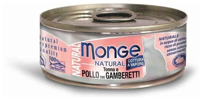 Влажный корм Monge Natural для взрослых кошек тунец с курицей и креветками 80г (70007252)
