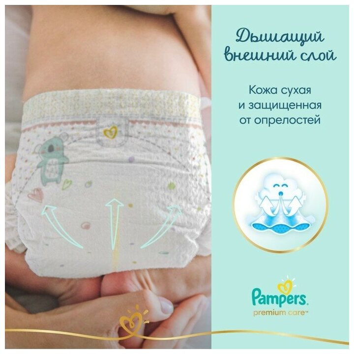 Pampers Premium Care - №1 подгузники для новорожденных в России*. Мягкие, воздушные и сухие, окружают кожу вашего малыша облаком комфорта! Дарят нежной коже новорожденного малыша комфорт и защиту. Уникальный мягкий верхний слой Pampers Premium Care создан специально для быстрого впитывания влаги и жидкого стула.