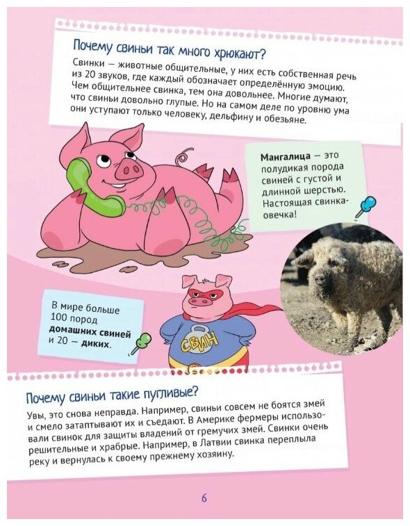 Меня всегда поражала способность детей интересоваться самыми разными тематиками, и способность впитывать эту информацию с неподдельным интересом. В этой книге есть масса самых каверзных вопросов от детей - например, почему нос у свиньи называются пятачком, почему у овцы густая шерсть, почему утки крякают, почему хомяки любят бегать в колесе и еще многое-многое другое. Обо всех домашних животных, в том числе и о коровах, овцах, грызунах, и рыбках. Книга очень понравилась и мне и моему ребенку, ее можно взять с собой в дорогу (тоненькая в мягкой обложке) или в очередь, скоротать время. Факты подобраны действительно очень интересные и занимательные, текста на каждый вопроса как раз столько, сколько хватит терпения прочитать только еще научившемуся читать ребенку. Цена очень приятная. Забыла о заданиях написать - они самые разнообразные, ручку только с собой не забудьте взять или карандаш :)
