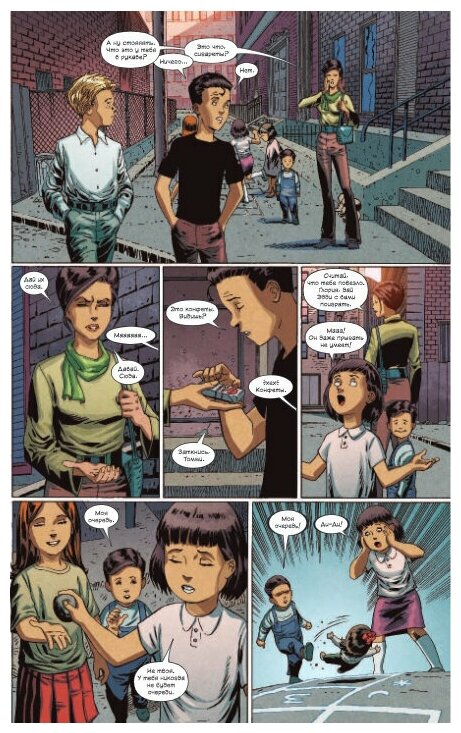 шрифт традиционно убогий, то есть реплики написаны не полностью заглавными буквами, как это принято в комиксах. Мелочь, да, но есть ведь стандарты. Я ещё понимаю, первые тома - они выходили во времена, когда рынок, по сути, был пустой, но сейчас-то... АСТ, ну посмотрите вы на своих коллег, которые на комиксах специализируются, ну научитесь наконец нормально заполнять пузыри!