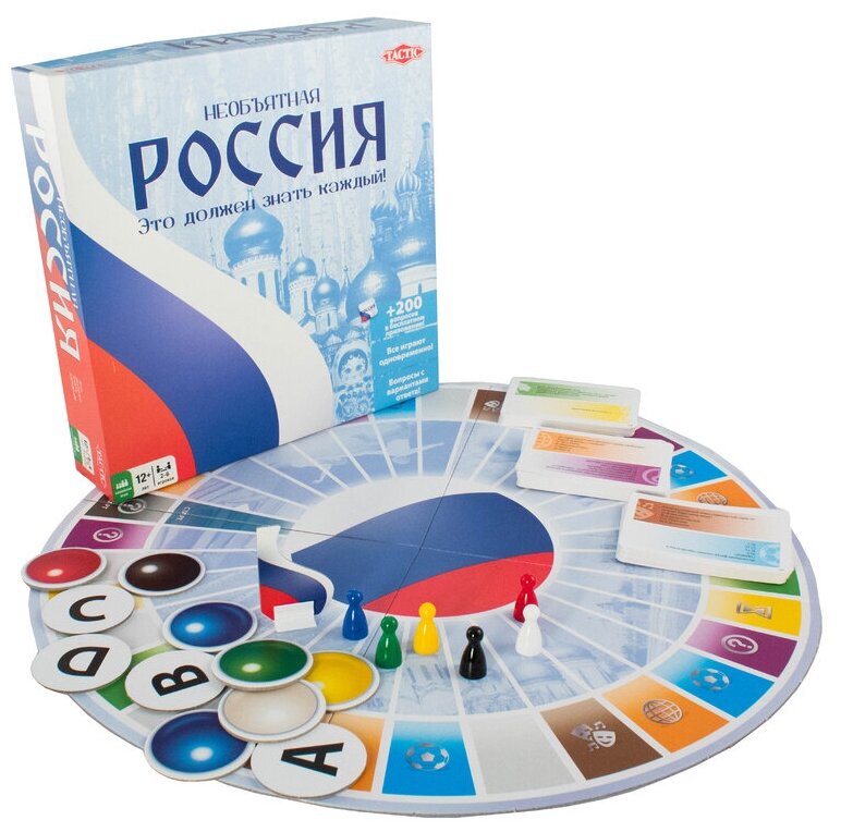 Настольная игра Необъятная Россия - это обновленное издание известной классической викторины. Она включает в себя карточки с 800 увлекательными вопросами о России. Все вопросы разбиты на 6 различных категорий: история, наука и природа, география, культура и другие. Участники смогут выбирать ответ из четырех возможных вариантов, в этом им помогут интересные комментарии к ответам. Простые и доступные правила викторины понравятся взрослым и детям. Юные участники смогут в игровой форме изучить необычные и любопытные факты о самом большом государстве мира. На каждой из карточек расположены два вопроса, каждый из которых выделен цветом соответствующей категории. Поле выполнено в форме круга с большим флагом России в центре. Окружность разбита на разноцветные секторы с указанием категории вопросов. За каждый верный ответ участники получают по одному жетону цвета выбранной категории. Чтобы попасть в суперфинал и победить, игрок должен собрать жетоны всех шести цветов. Игра рассчитана на от 2 до 6 игроков в возрасте от 12 лет. Время игры от 45 минут.Отправляйтесь в увлекательное путешествие по России вместе с популярной игрой от бренда Tactic Games! Для тех, кого заинтересуют новые факты о нашей стране, разработано бесплатное приложение для iOs и Android: Необъятная Россия включает в себя 200 дополнительных вопросов с красивыми визуальными эффектами.