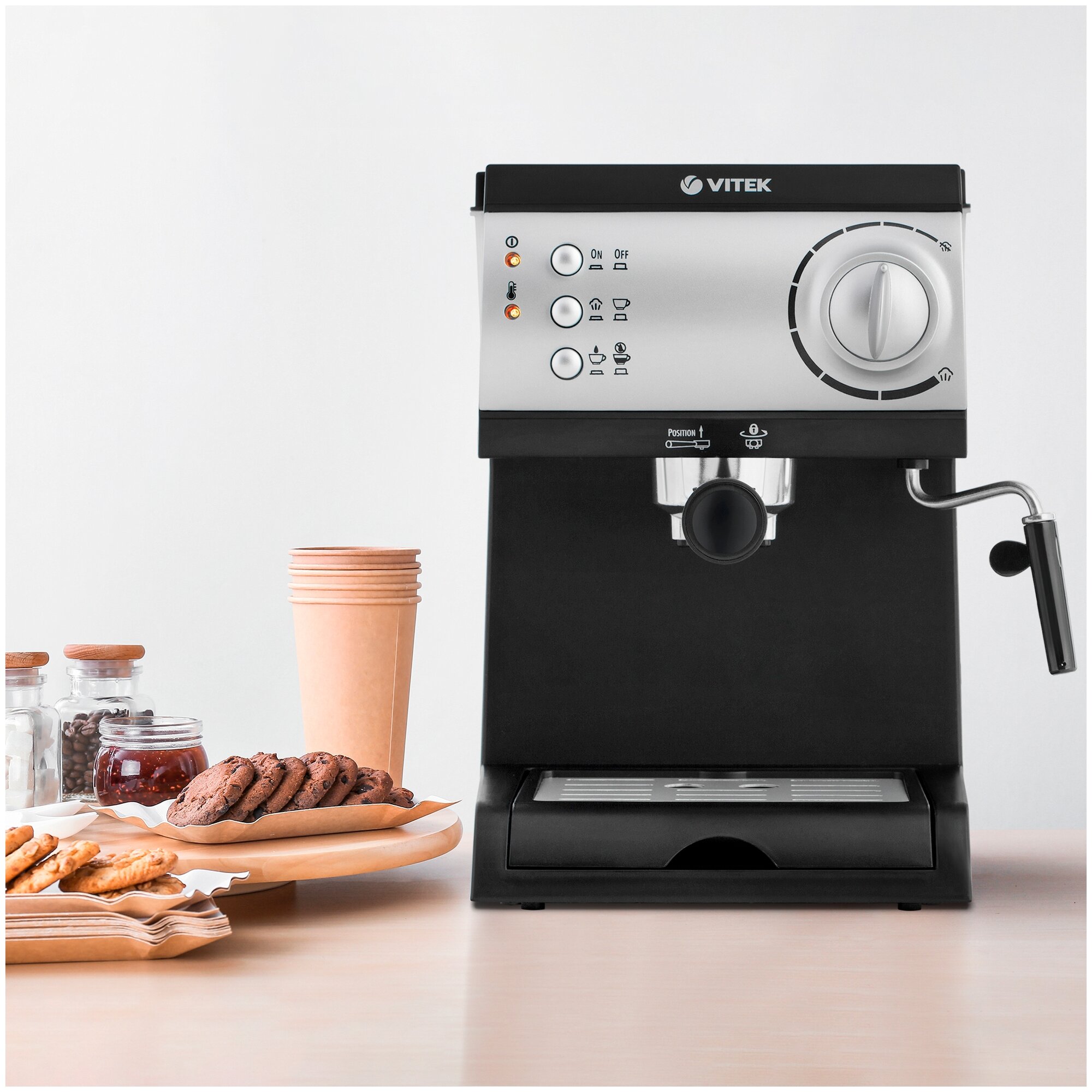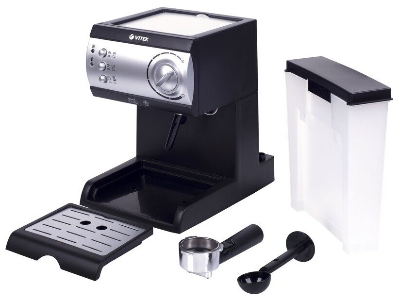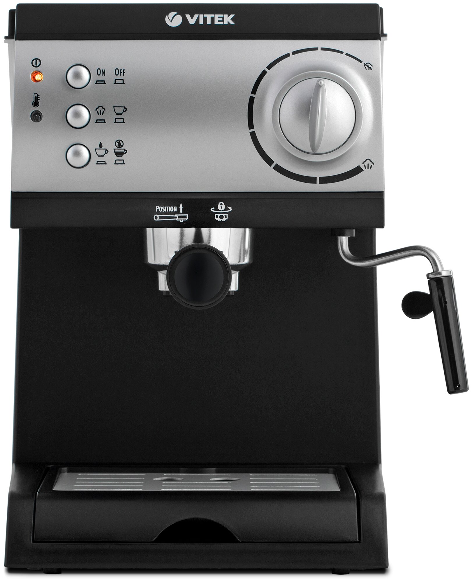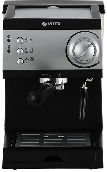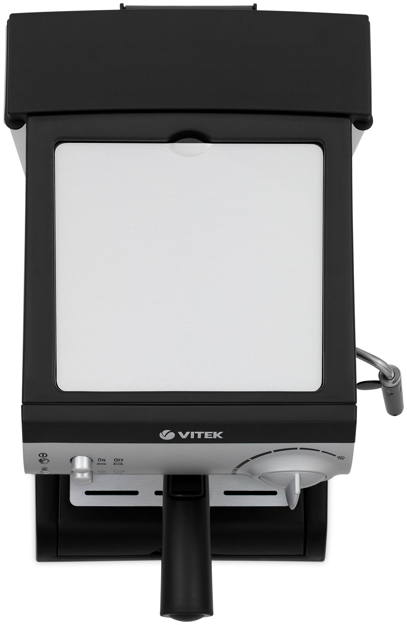 Vitek — кофеварка рожкового типа, предназнаенная для приготовления напитков из молотого кофе. Кофеварку можно использоваться для одновременного приготовления двух чашек кофе. Максимальная высота чашек — 10 см. Имеется функция подогрева чашек, каплесборник с алюминиевой решёткой, а также индикация включения, готовности к работе, а также индикация уровня воды. Vitek оснащена трубкой для подачи пара, которая позволяет сделать молочную пену для капучино или горячего шоколада.