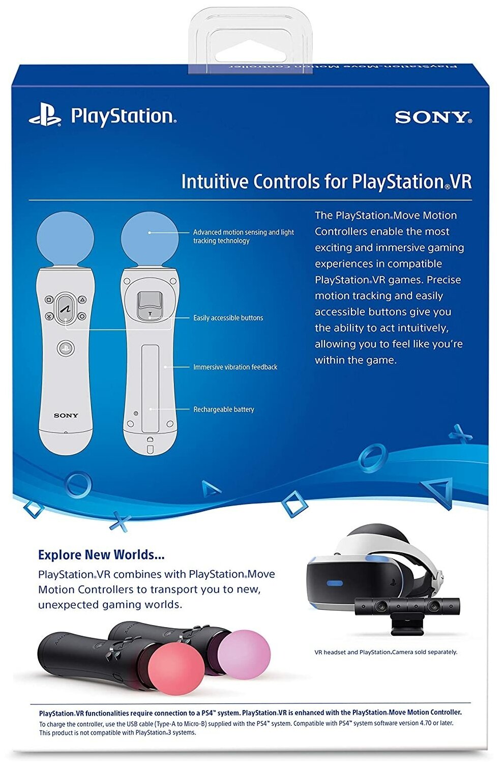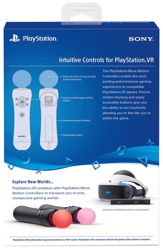 Наслаждайтесь PlayStation VR благодаря двум контроллерам движений PlayStation Move в совместимых играх. Благодаря легкому дизайну, улучшенным датчикам движения и светящемуся шарику контроллер движений PlayStation Move позволяет вам легко и точно взаимодействовать с виртуальными мирами.