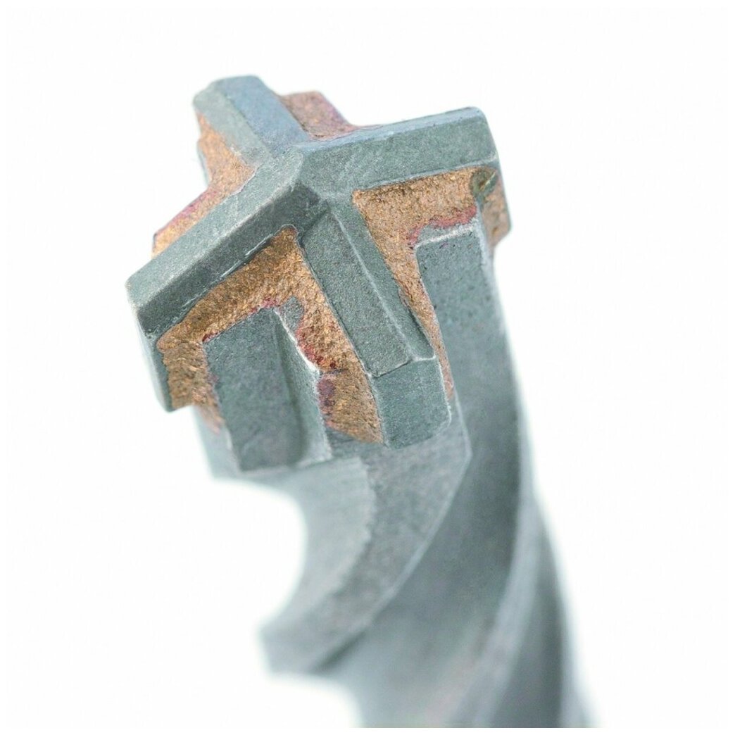Отличительными элементами этих буров является крестовая твердосплавная пластинка из ВК8, четыре резца которой позволяют более четко удерживать инструмент в отверстии и предотвращать закусывание при попадании в арматуру.
