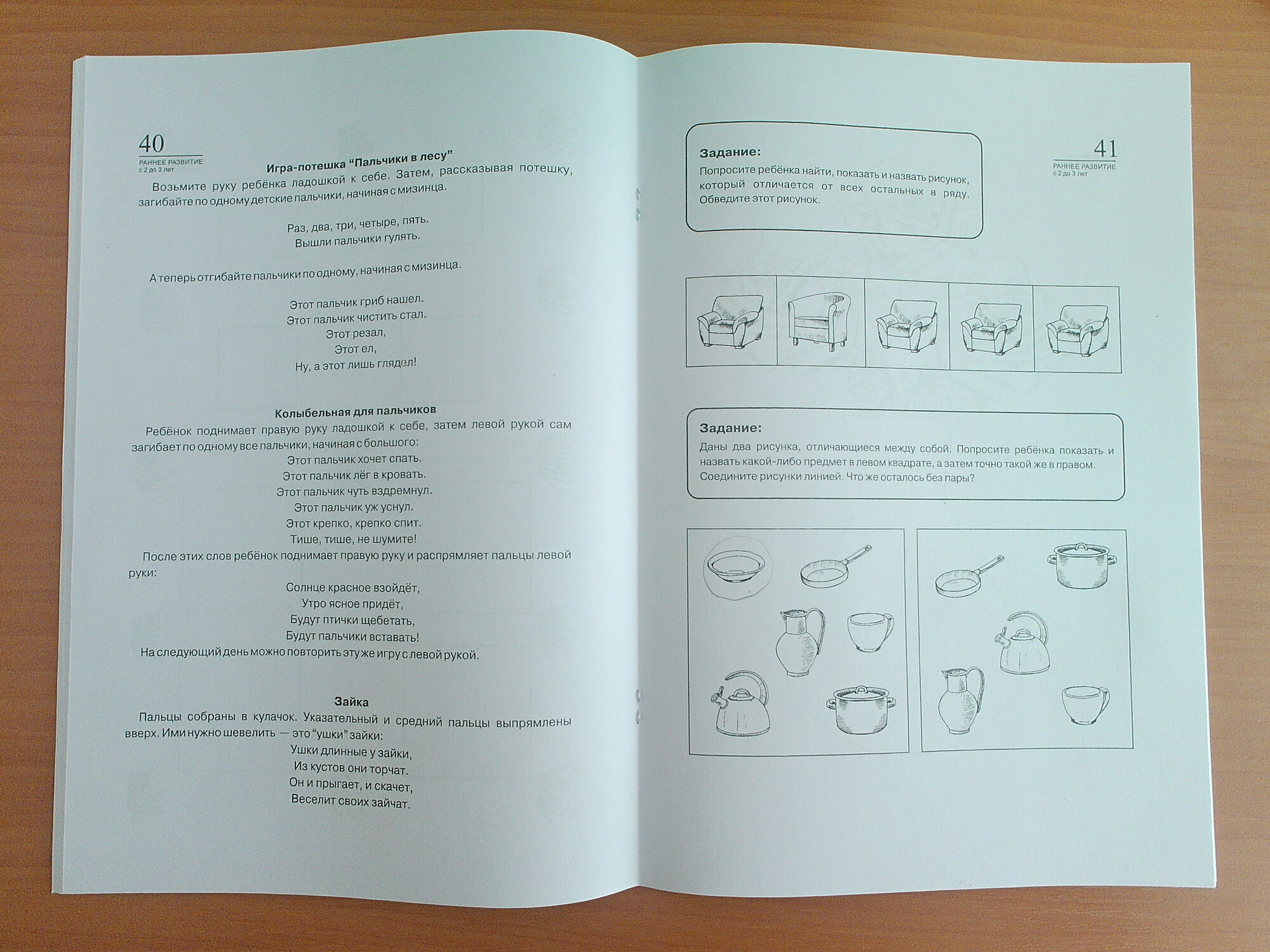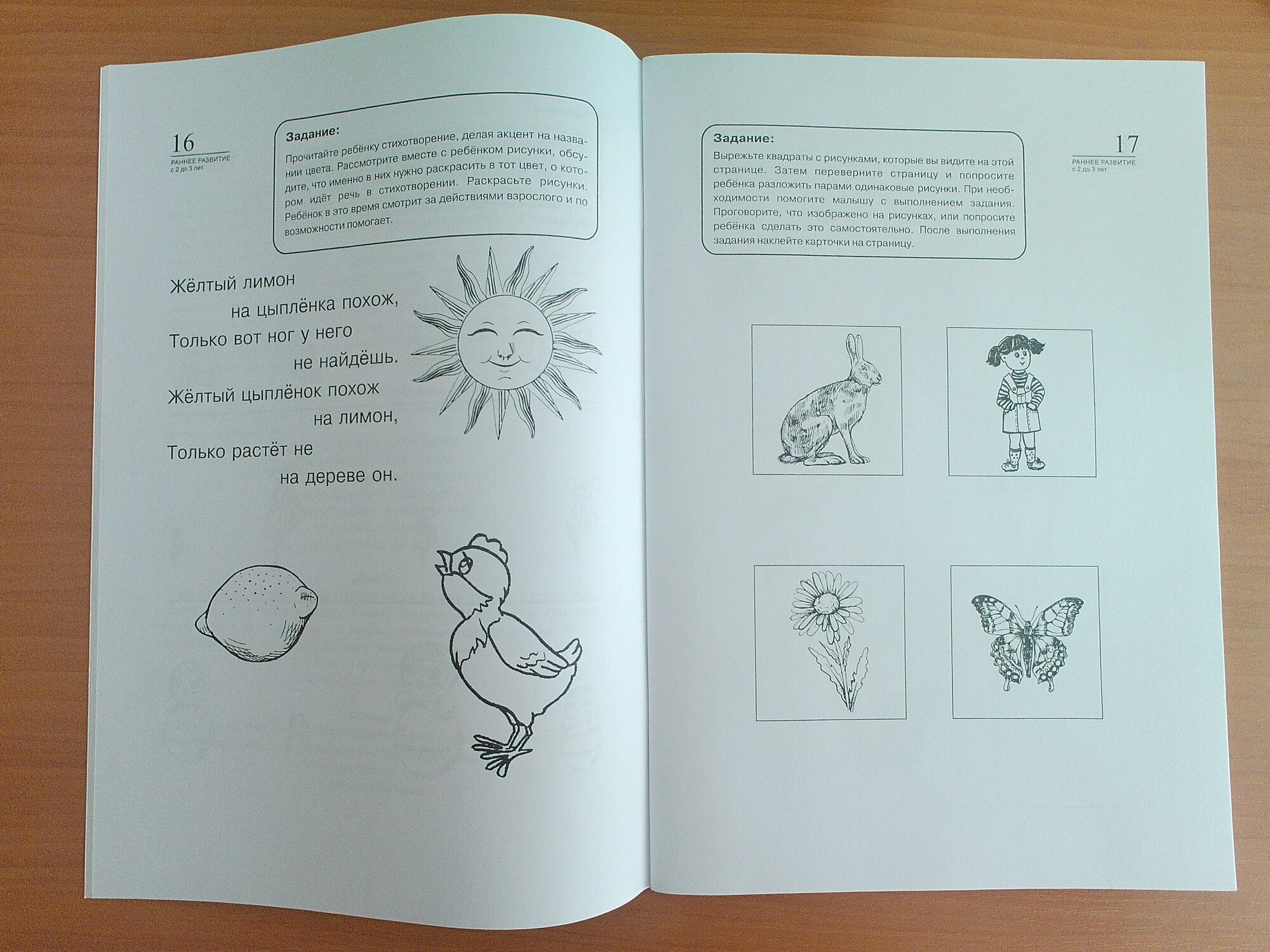 Ребёнку скоро 3 года, задания проходит легко. Несмотря на то, что пособие черно-белое, заниматься легко и интересно. Много надо вырезать, много заданий на сбор картинок, подстановки деталей по размеру, игровых рулеток на запоминание окружающего мира. Задания на сравнение, на раскрашивание. То есть, хорошее пособие по общему развитию. Ребёнок хочет заниматься и с удовольствием делает все задания. Вторую часть купила, не задумываясь