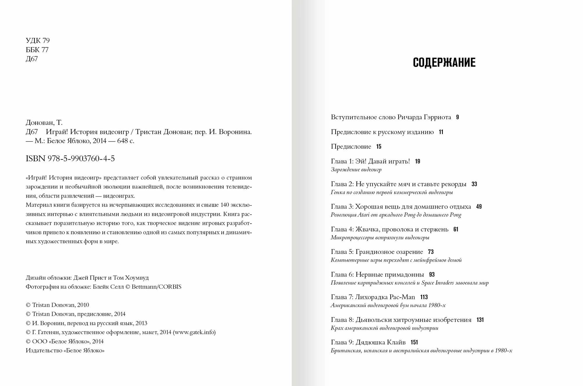 В своей книге "Играй! История видеоигр" британский журналист Тристан Донован дотошно исследует тот путь, который прошли видео-и компьютерные игры с момента своего зарождения в послевоенном мире. "Настоящая история видеоигр - это история человеческой креативности, которой помогает технологический рост, - объясняет сам Донован. - Цель "Играй!" -воспеть живучесть и богатейшее творческое воображение наиболее талантливых создателей игр и рассказать о том, почему развитие видеоигр пошло так, а не иначе".
