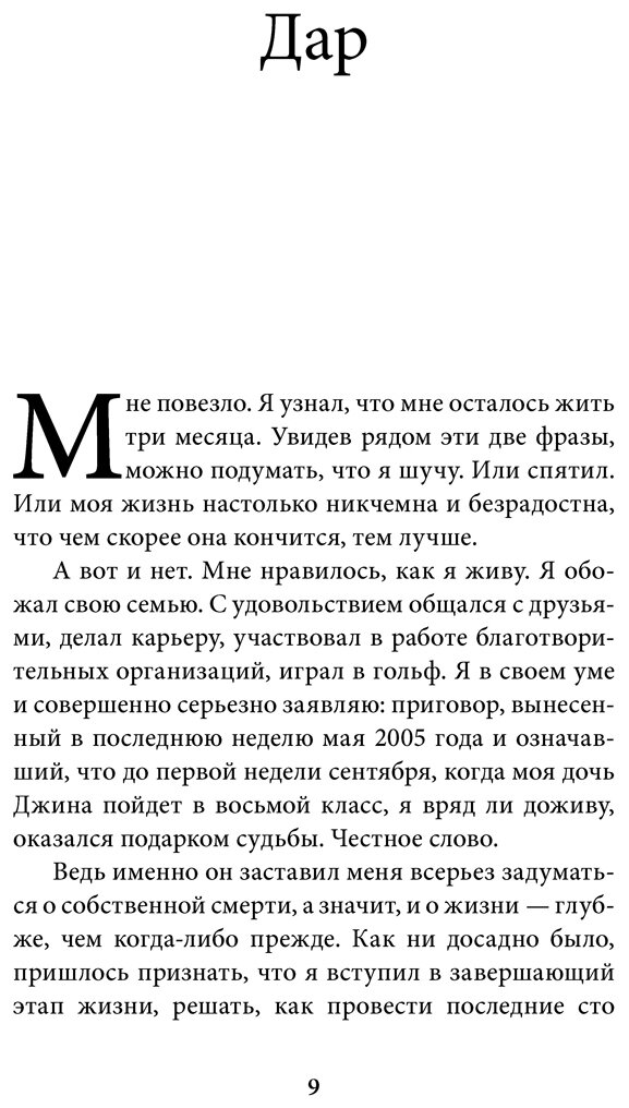 Писатель и является главным героем книги. Итак, один из успешных бизнесменов Америки в 53 года узнает, что у него рак головного мозга на последней стадии... к сожалению неоперабельный…и ему осталось жить всего 3 месяца!!! Единственное чем обрадовали врачи, что эти 3 месяца не будут болезненными, и он сможет нормально существовать. Герой решил отнестись к этим 3 месяцам как к подарку судьбы…и успеть сделать все то, что не успел, сделать эти 3 месяца насыщенными...