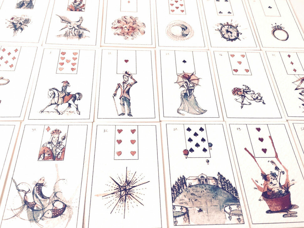 honors the Lenormand tradition with stylized illustrations that concisely convey the meaning at the heart of each card. In addition to the 36 core cards, designer , Ryan Edward has created 16 additional cards to complete a 52-card pack, following the heritage of fortune telling cards based on playing card decks. The expanded deck affords precise readings with detailed answers.