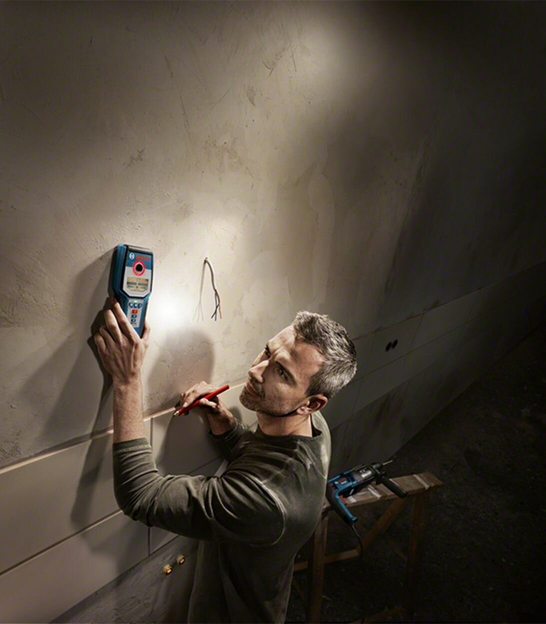 Детектор Bosch "GMS 120" применяется при необходимости обнаружения проводки (а также других металлов, включая цветные) и деревянных внутренних конструкций. Светодиодный индикатор загорается зеленым цветом при отсутствии обнаруженных объектов. При обнаружении объекта индикатор загорается красным цветом. Для точного определения местоположения объекта предусмотрены несколько режимов работы: токопроводящий кабель, гипсокартон, металл.