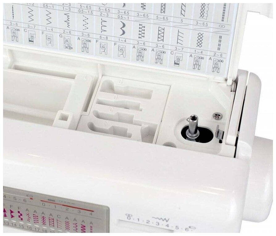 Большая комплектация лапок. Тихо работает. Прошивает любой материал - кожа 3 сложения берет.