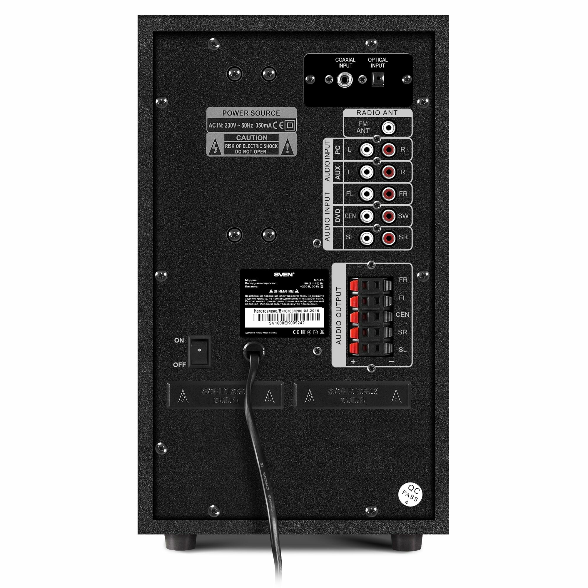 Акустическая система Sven разработана специально для подключения к домашнему кинотеатру. Она снабжена оптическим и коаксиальным входом, способными работать с многоканальным сигналом высокого разрешения.