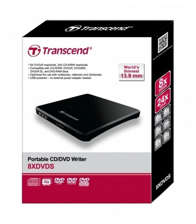 Ультратонкий портативный пишущий CD/DVD привод компании Transcend - это идеальное дополнение современных тонких и лёгких ноутбуков, нетбуков и ультрабуков, независимо от того, что вы собираетесь делать при работе в мобильных условиях - смотреть фильмы, устанавливать программы или создавать резервную копию файлов. Для дополнительного удобства работы, пишущий CD/DVD привод комплектуется доступным для бесплатной загрузки потрясающе полезным программным обеспечением CyberLink Media Suite 10 (Power2Go & MediaShow) для записи данных.