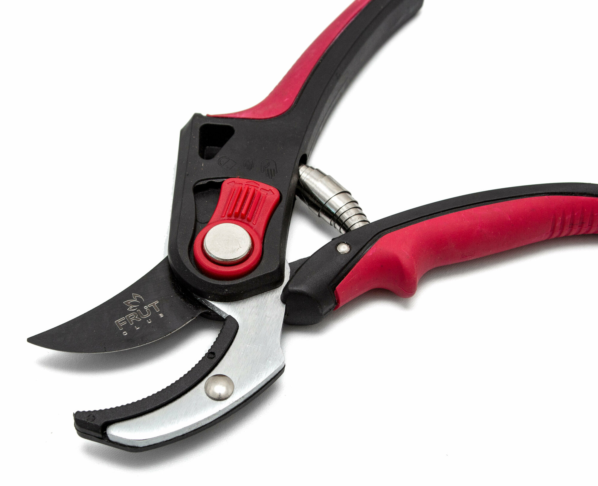 Секатор с наковаленкой и пластиковыми ручками FRUT CLUB - это прочный садовый инструмент с фиксатором лезвий и регулятором раскрытия под размер руки. Изделие служит для обрезания сухих веток. Лезвия изготовлены из высокоуглеродистой стали. На верхнее лезвие нанесено илофлоновое покрытие.