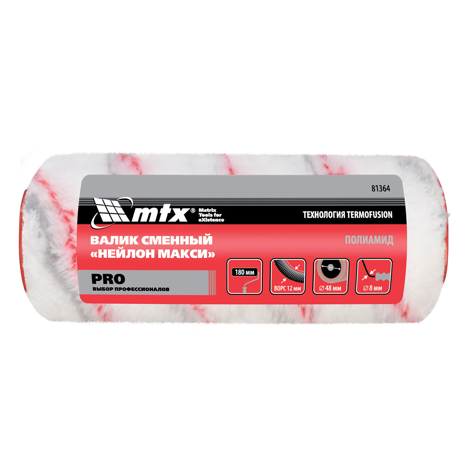 Сменный валик MTX PRO «НЕЙЛОН МАКСИ» с ворсом 12 мм, шириной 180 мм, диаметром ролика 48 мм, устанавливается на бюгель диаметром 8 мм и используется для окрашивания гладких и шероховатых поверхностей. Ширина валика позволяет быстро обрабатывать участки большого размера.