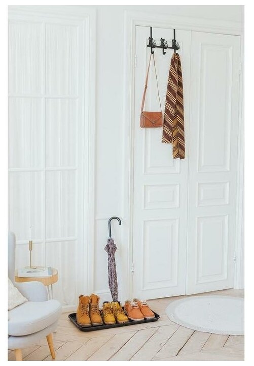 Цвет лотка для обуви универсальный черный, он отлично впишется в любой интерьер и цветовые решения прихожей. Позволяет удачно разместить несколько пар обуви.