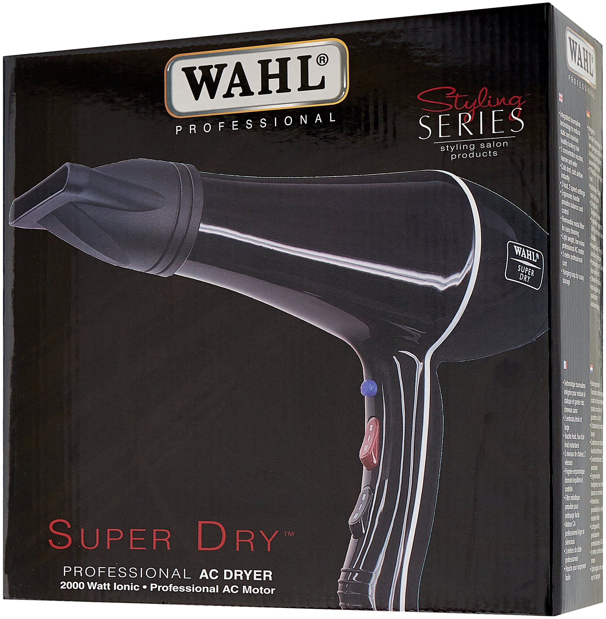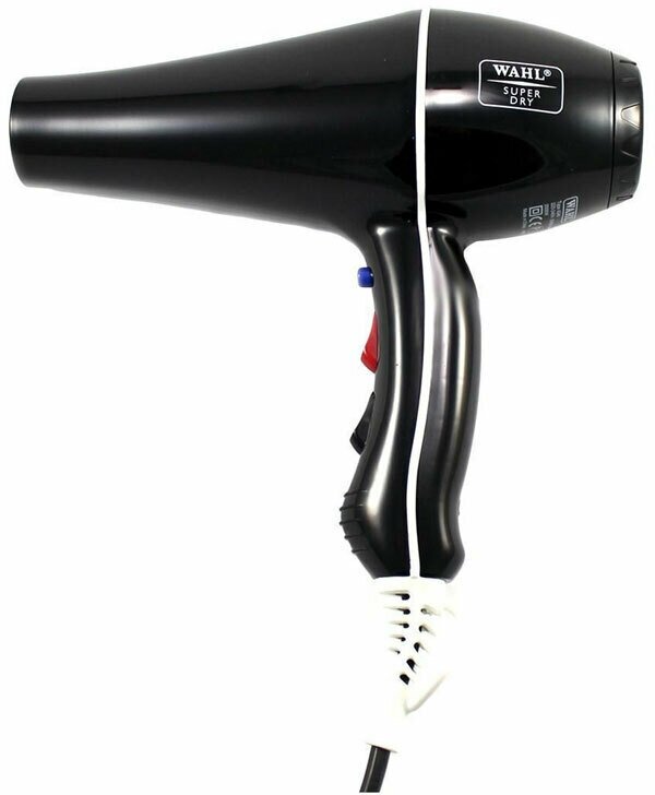Moser фен профессиональный Wahl Super Dry черный 2000 Вт. Один из самых мощных в мире среди компактных фенов по скорости выдувания воздуха - производительтность 30л/сек. Мощность - 2000 Вт. По техническим характеристикам сравним с некоторыми моделями компрессоров для сушки животных. Имеет функцию турмалиновой ионизации. 2 скоростных и 3 температурных режима, отдельная кнопка подачи холодного воздуха. Гибкий трехметровый кабель с кольцом для подвешивания фена. В комплект входят 2 профессиональные насадки. Идеальный спутник профессионального грумера в дальних поездках!