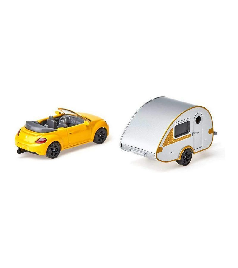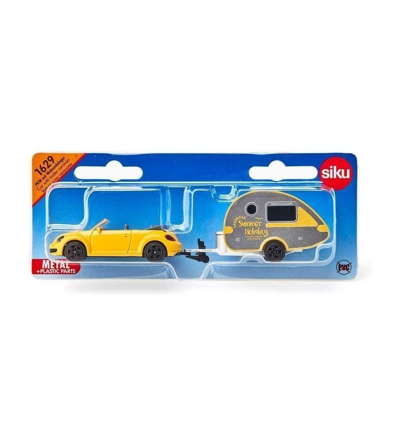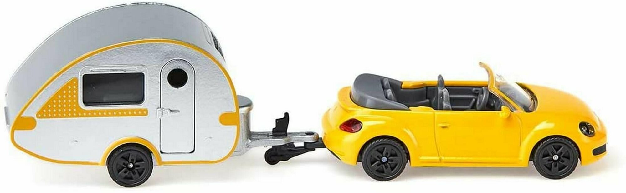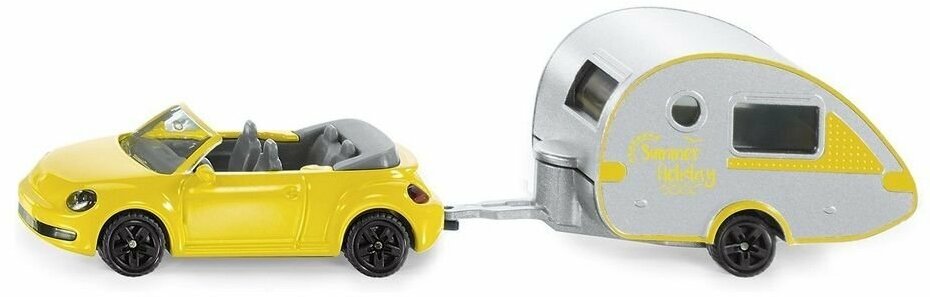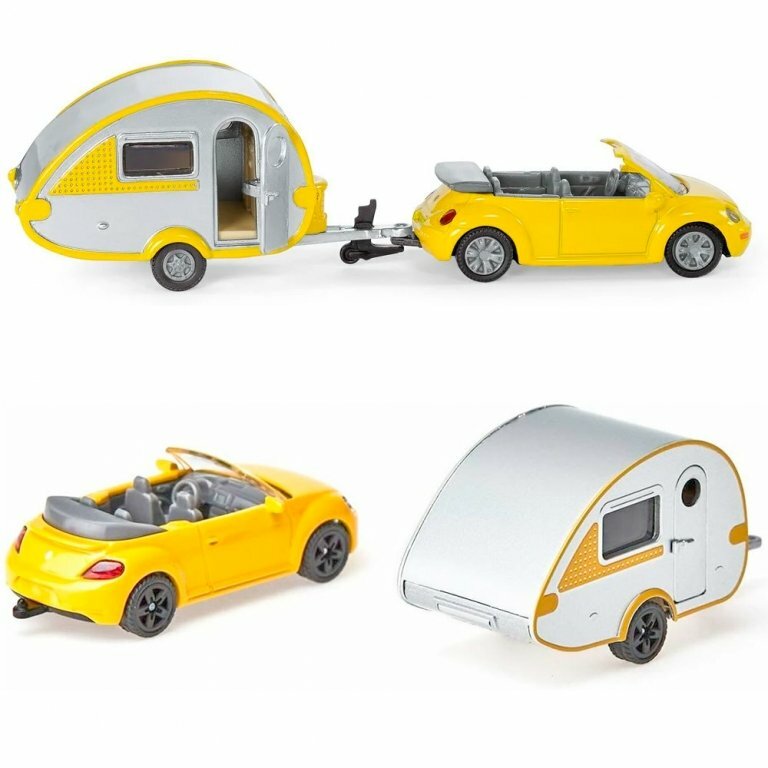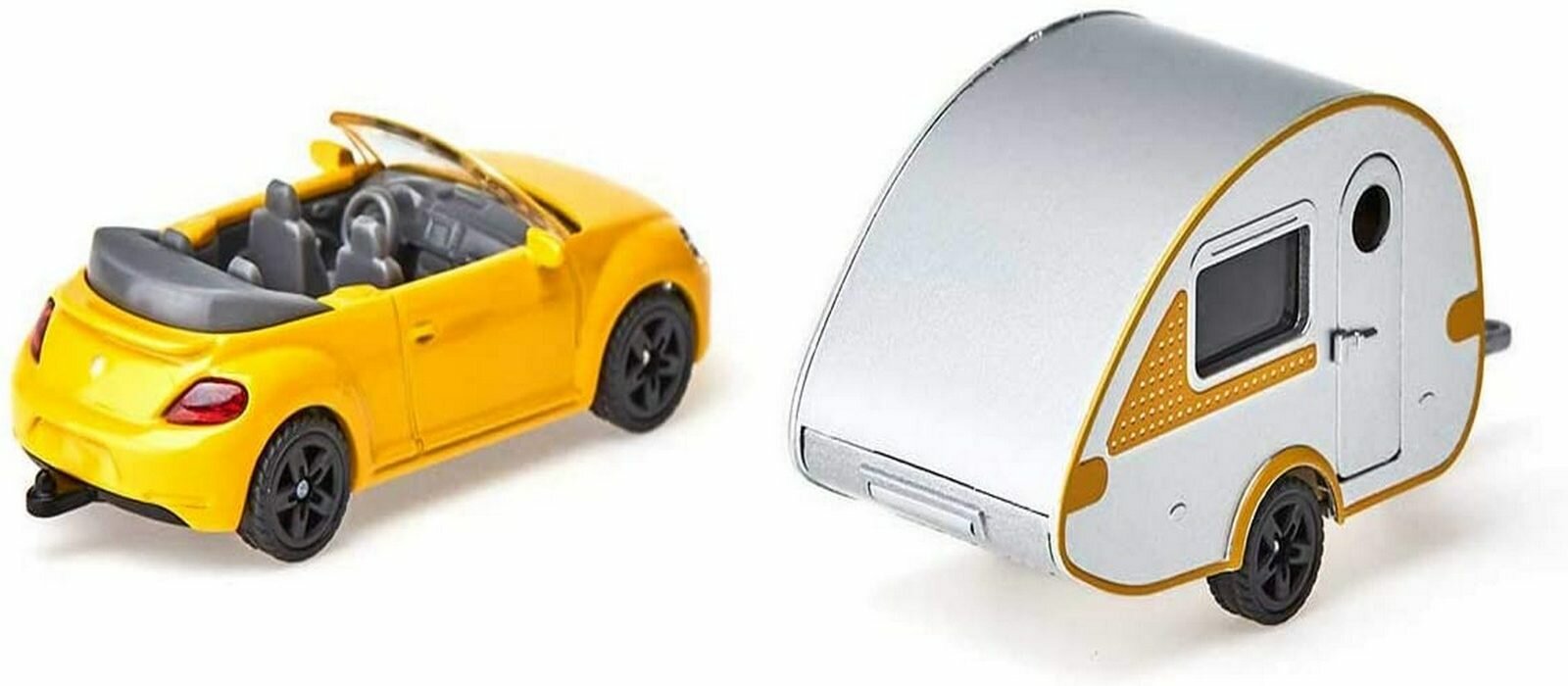 Siku Автомобиль VW Жук с прицепом 1629 модель автомобиль с прицепом жилым фургоном, корпус машины и прицепа выполнены из металла, колёса выполнены из резины и вращаются, можно катать. Прицеп отцепляется от машины.