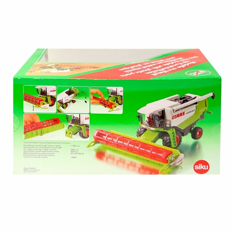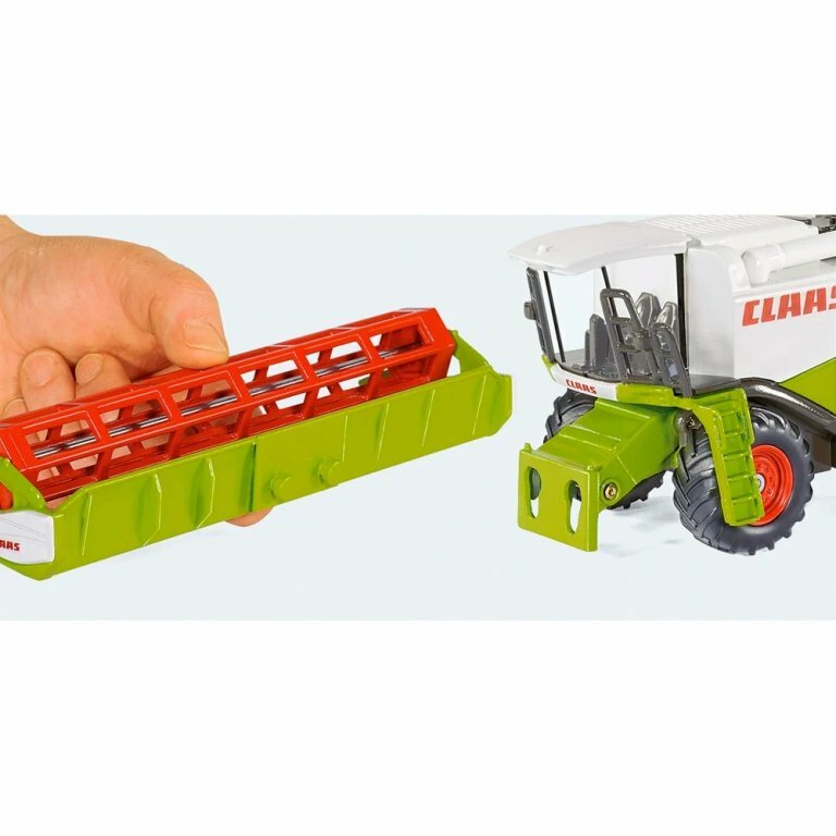 Комбайн Siku Клаас выполнен из металла и пластика, вращающиеся колёса резиновые. Задние колёса поворачиваются с помощью специального рычага. Прицеп-жатку спереди можно снимать, выгрузной шнек можно поворачивать.
