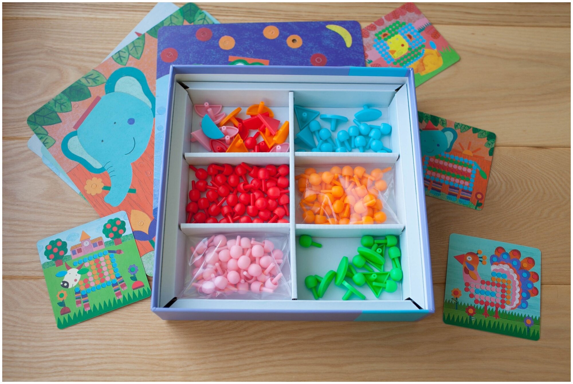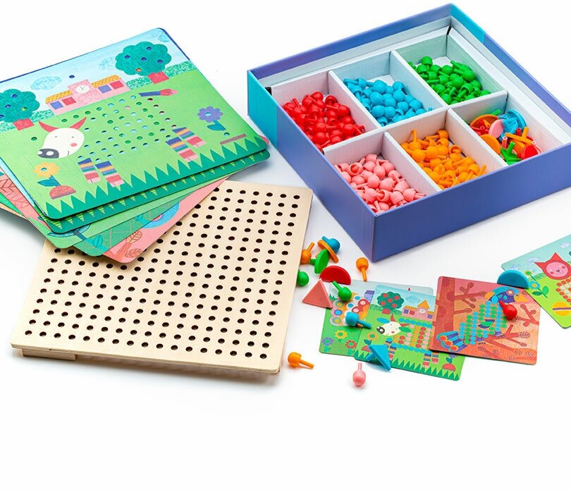 | Состав набора | Деревянная основа, 8 карточек с заданиями, 230 маленьких разноцветных гвоздиков разной формы |