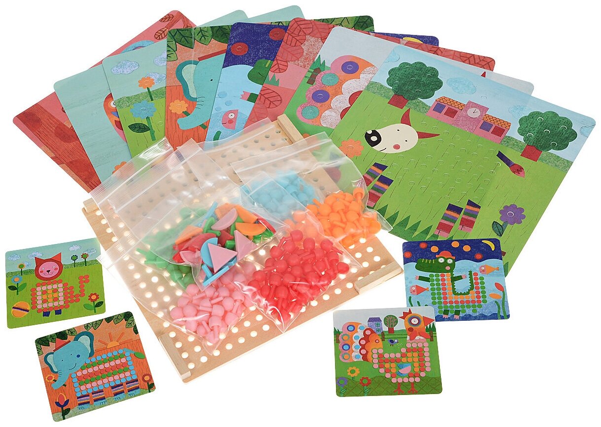 В комплекте ребенок найдет деревянную основу, красочные карточки с заданиями, а также множество пластиковых гвоздиков разной формы. Ребенок должен собрать картинку согласно инструкции, в результате чего у него получатся яркий петушок, забавный слоненок, красочный львенок и другие животные и насекомые. Игра прекрасно развивает фантазию и воображение ребенка, детскую моторику, логическое мышление и сообразительность. Набор изготовлен из безопасных высококачественных материалов. Изображения покрыты безопасными