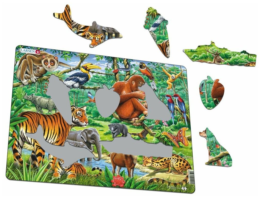 Пазлы Ларсен - это прежде всего обучающие пазлы. Яркая серия Флора и Фауна предназначена для детей от 6 лет. На пазле представлен животный мир азиатских джунглей. Виды: тонкий лори, большой двурогий калао, красноголовый крайт, краснозатылочный азиатский трогон, белорукий гиббон, индийский носорог, красноклювая альциона, орангутан, синегорлая щурка, тигр, индийский слон, малайский медведь, индийская летучая лисица, павлиноглазка атлас, замбар, пятнистый линзанг, этлингера высокая (цветок). С фотографической точностью прорисованы обитатели и растительный мир самых отдаленных уголков планеты. Многообразие форм вырубки и различные размеры отдельных элементов способствуют развитию мелкой моторики у малышей. Сделанные из высококачественного трехслойного картона, они не деформируются и легко берутся в руки. Все пазлы снабжены специальной подложкой, благодаря чему их удобно собирать. Красочный пазл станет замечательным оригинальным подарком, которым можно пользоваться не один раз. В наборе: 20 элементов пазла. Размер собранного поля - 36,5 х 28,5 см.