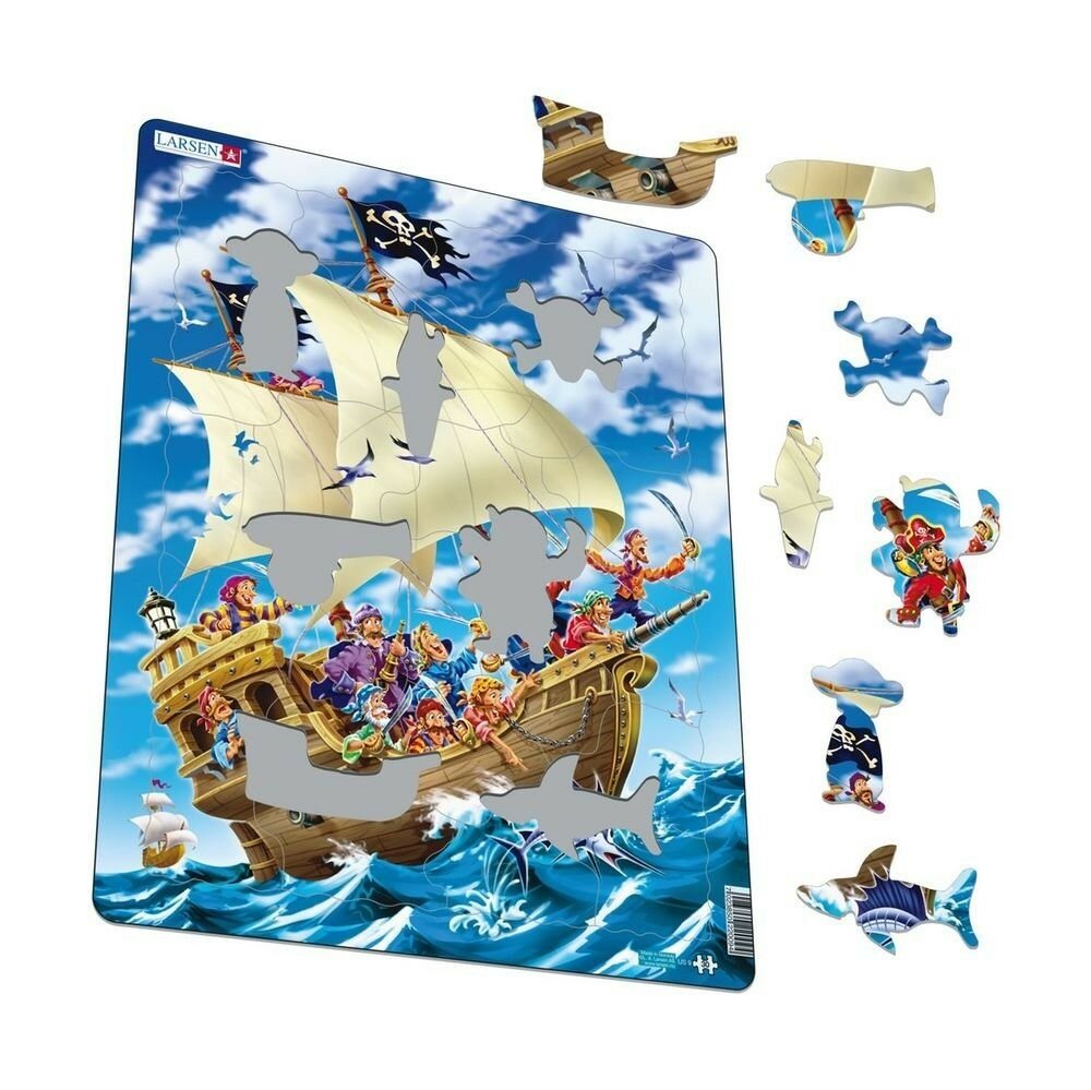 Larsen Пазл Пираты US9 " веселая и отважная компания пиратов направляется на новые поиски затерянных сокровищ. Красивый пазл из 30 деталей выполнен из высококачественного трехслойного картона. Каждая деталь имеет свой размер и особую форму, что позволяет Вашему ребенку развивать навыки мелкой моторики.