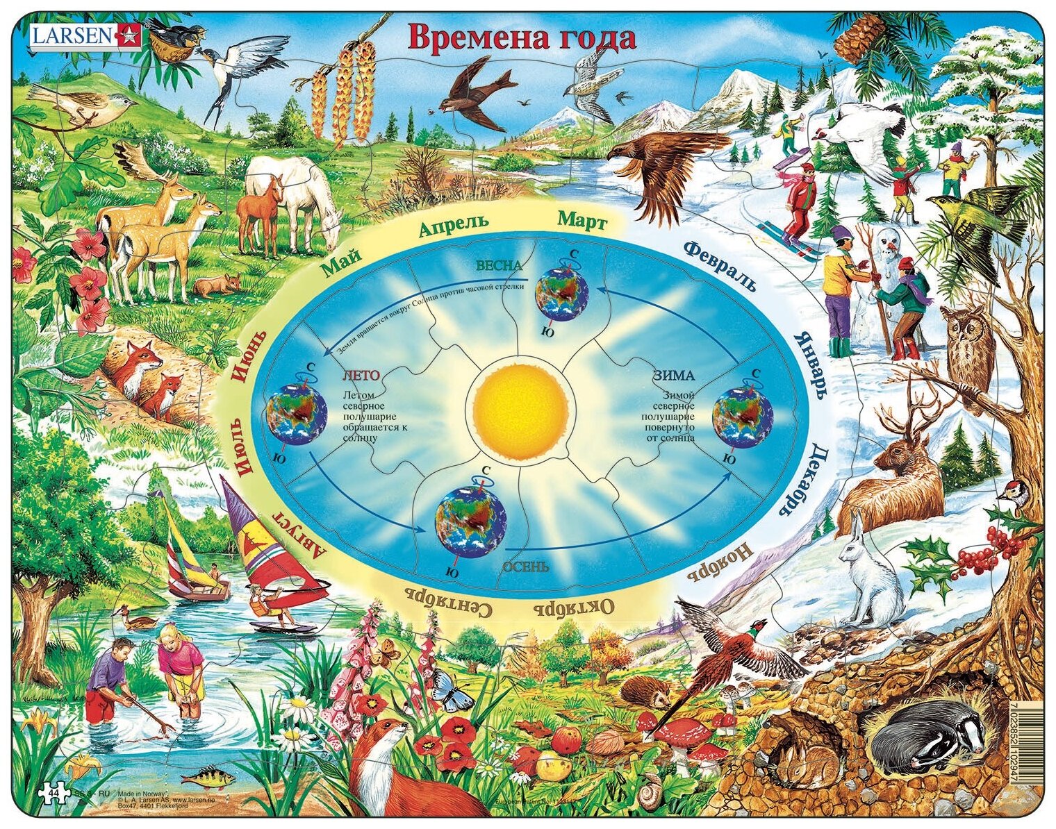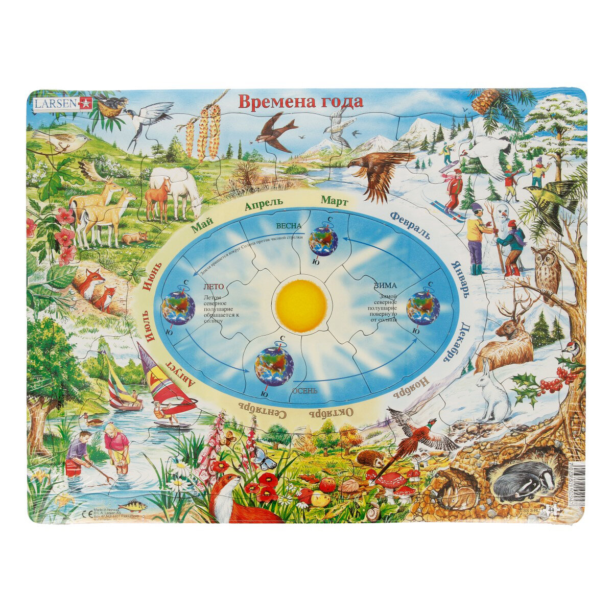 Познакомьте ребенка в занимательной форме с временами года и вращением земли вокруг Солнца. Многообразие форм вырубки и различные размеры отдельных элементов способствуют развитию мелкой моторики у малышей. Пазлы Ларсен всесторонне влияют на развитие малыша. В процессе игры с мелкими деталями развивается моторика пальчиков, красочные картинки стимулируют воображение, мышление и память. Детали пазла выполнены из качественного трехслойного картона. В наборе: 44 элемента пазла. Размер собранного поля - 36,5 х 28,5 см.