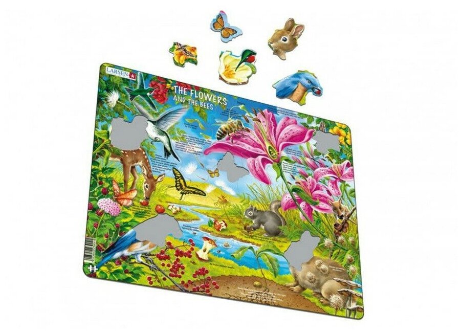 Образовательный пазл Larsen в игровой форме познакомит малыша с таким интересным природным явлением как опыление цветов. На яркой картинке наглядно показано, как происходит рост цветка, как появляется семечко, как цветок опыляют насекомые, как ветер разносит семена и как они снова попадают в землю. Собирая разноцветные детали пазла, малыш не только тренирует мелкую моторику рук, развивает логическое мышление и внимательность, но и знакомится с основами природоведения. Различные формы вырубки и размеры деталей пазлов Larsen делают эти пазлы невероятно интересными и полезными для детей разных возрастов. Пазлы Ларсен выполнены из трехслойного картона высокого качества, не деформируются, удобны для маленьких детских ручек. Пазлы оснащены подложкой, благодаря чему ребенку их удобно собирать. В наборе: 55 элементов пазла. Размер собранного поля - 36,5 х 28,5 см.