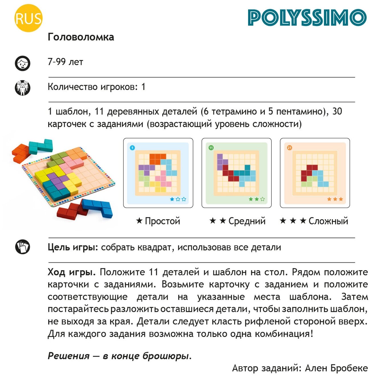 Игра Полиссимо от французского производителя развивающих игр Djeco - увлекательная игра-головоломка для детей, которая надолго увлечет ребенка и станет прекрасной развивающей игрой.В наборе ребёнок найдет несколько красочных деревянных деталей разных форм и размеров, а также карточки с заданиями разной степени сложности. На каждой карточке указан уровень сложности и исходное положение некоторых деталей. Ребенку необходимо понять, каким образом расположить остальные детали, чтобы собрать остальные детали на карточке. Решения, по которым ребенок сможет проверить себя, входят в комплект. В игру может играть как один человек, так и несколько. Игра продается в красочной коробке и идеально подходит в качестве подарка. Игра-головоломка Полиссимо замечательно подходит для детей раннего школьного возраста, с её помощью у малыша возникнет понимание форм, объёмов различных сложных фигур.