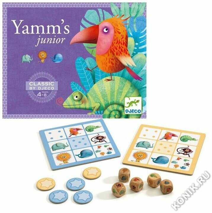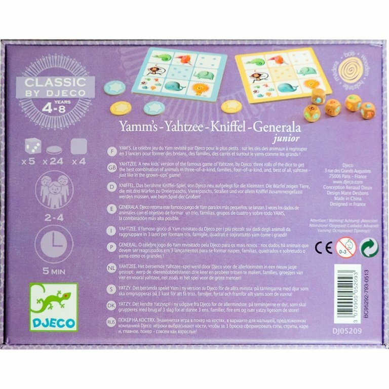 Новая версия знаменитой детской игры покер – настольная игра Ямс. Бросайте кубики по очереди и соберите лучшую комбинацию трех изображений животных. Увлекательная настольная игра понравится как детям, так и взрослым. Настольная игра Ямс прекрасно подойдет в качестве развлечения для любого детского праздника. Игра развивает логическое мышление, сообразительность и внимательность. Карточки изготовлены из прочного многослойного картона. Изображения созданы современными французскими художниками. Настольная игра Ямс от Djeco в красочной упаковке станет отличным подарком для каждого ребенка. В наборе: 5 деревянных кубиков, 24 карточки звезд и 4 игровых платы. Количество игроков: 2-4 человека. Размер: 20 х 8 х 2 см. Инструкция на русском языке.