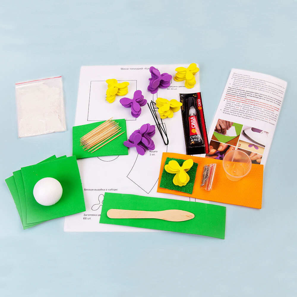 "Топиарий — это дерево счастья, которое можно «вырастить» своими руками. Созданная детскими руками поделка на долгие года может стать необычным украшением интерьера, большое количество расцветок, разнообразие соцветий и бутонов поможет собрать свой «волшебный» сад дома.В процессе сборки у ребенка развивается мелкая моторика, усидчивость, объемное мышление, чувство композиции, творческий подход. Топиарий может стать прекрасным подарком к практически любому празднику, а если вы положите записку с заветным желанием в гипс оно обязательно исполнится.Все необходимое, включено в комплект, включая пошаговую подробную инструкцию. Буря эмоций и позитива вам обеспечены! "