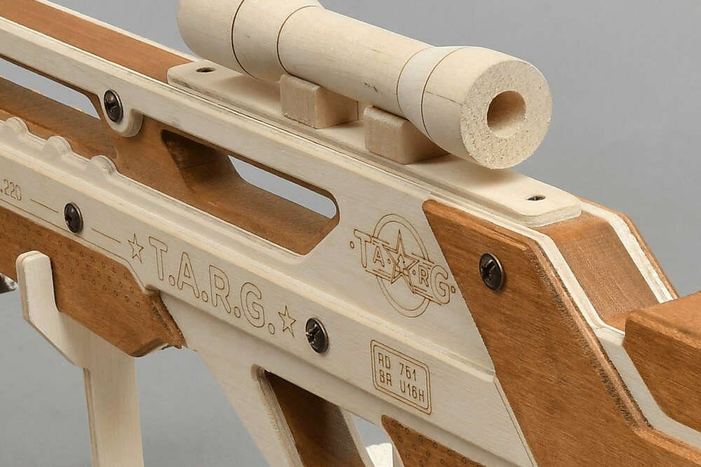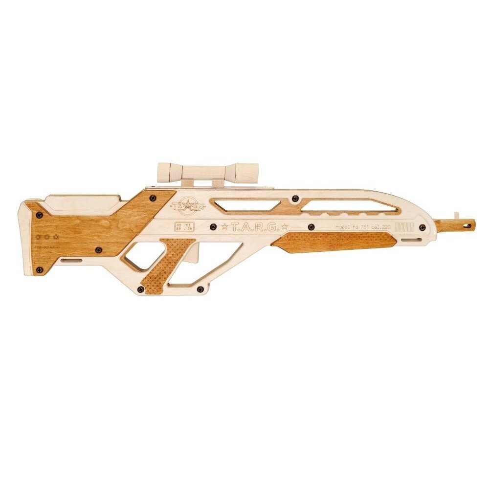 "INVADER — детализированная копия концептуального карабина «Сарыч» со множеством конструктивных подробностей, повторяющих прототип модели. Оригинальный дизайн корпуса и штатный прицел придают винтовке «космический» вид. Вам понадобится совсем немного времени и усилий, чтобы готовая деревянная модель оказалась у вас в руках и стала частью вашей собственной коллекции конструкторов T.A.R.G.!Размер модели: 64?19?3 см.Вес модели: 1300 г.Время сборки: 1–2 часа.Внутренний механизм модели издает звук. К готовой винтовке крепится наплечный ремень. Набор полностью укомплектован. Для сборки вам потребуется только крестовая отвертка. Лак и клей, входящие в набор, не токсичны и безопасны для детей. Характеристики карабина Калибр.220 (5,56 мм) или.308 Win (7,85 мм).Емкость магазина — 10 патронов.Начальная скорость полета пули до 900 м/с.Дальность эффективной стрельбы — 600 м с оптическим прицелом.Компоновка bullpup.Прототипом полуавтомата INVADER служит концептуальный карабин «Сарыч», разработанный в России в 2009 году. Пластиковый корпус «космического» дизайна типа «буллпап», в котором спусковой крючок расположен перед съемным магазином и ударным механизмом, позволяет расположить длинный ствол над коротким прикладом. Благодаря этому компактное оружие обладает характеристиками полноразмерных винтовок, идеально для использования в стесненных городских условиях и помещениях. Используется с оптическими прицелами кратности 4-8х.Это интересноВинтовка «полуавтомат» — самозарядное оружие, в котором выброс стрелянной гильзы и заряжание нового патрона происходит после выстрела автоматически благодаря энергии пороховых газов. Винтовку, в которой необходимо вручную передергивать затвор скользящего типа после каждого выстрела, называется «болтовка». "
