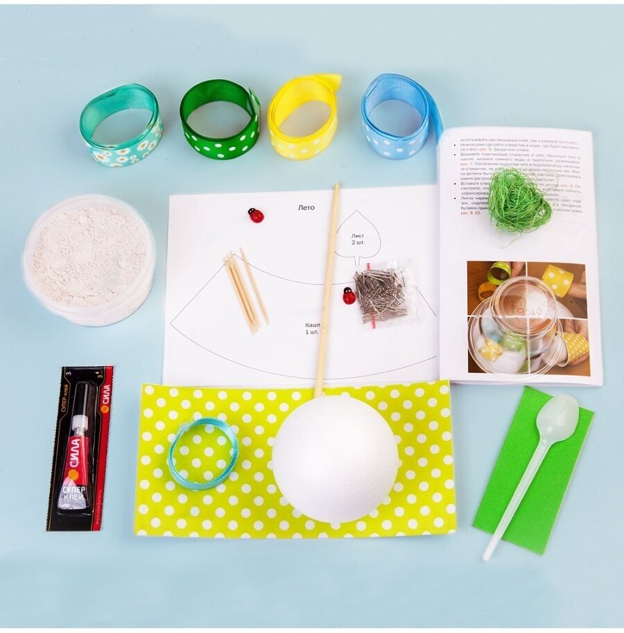 | Состав набора | пенопласт; пористая резина; деревянная палочка; ленты репсовая и атласная; сизаль; гвоздики-булавки; пластиковый стаканчик для кашпо; гипс; ложка; зубочистки; клей |