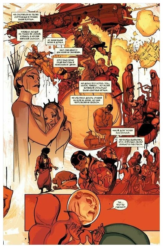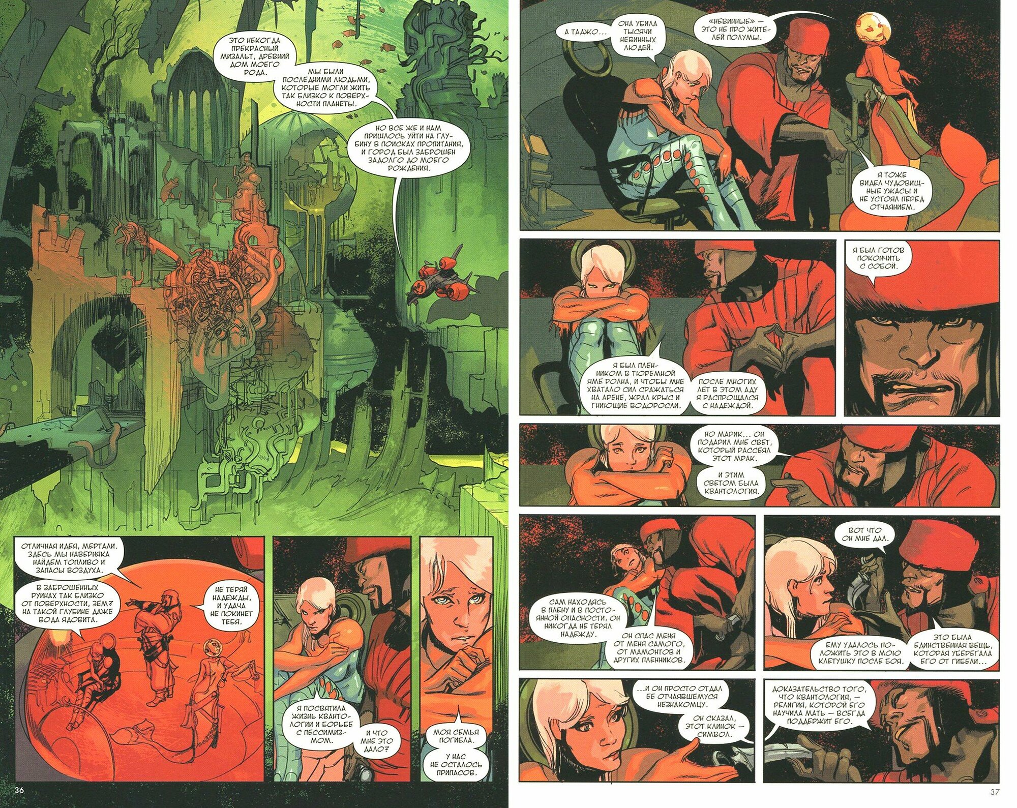 Вообще комикс очень эгоцентричен — он акцентируется исключительно на главных героях и постоянно показывает читателю только их одних, никак не раскрывая происходящее на заднем плане (этого я чуть подробнее коснусь, когда буду говорить о рисунке). На мой взгляд, стоило бы добавить всяких мелочей, вроде умирающего с голоду ребёнка, или жителей неблагополучных кварталов, которые быстрее остальных должны были почувствовать на себе нехватку чистого воздуха и еды. Но ничего этого нет, и поэтому атмосфера надвигающейся катастрофы не считывается.