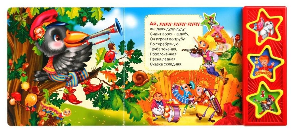 Ребёнок с удовольствием будет листать плотные страницы, рассматривать яркие картинки, нажимать на кнопки и слушать песенки. Малыш легко освоит включение звука: по нажатию на кнопку песенка включится, при втором нажатии выключится. Благодаря компактному формату книгу удобно взять с собой в дорогу.
