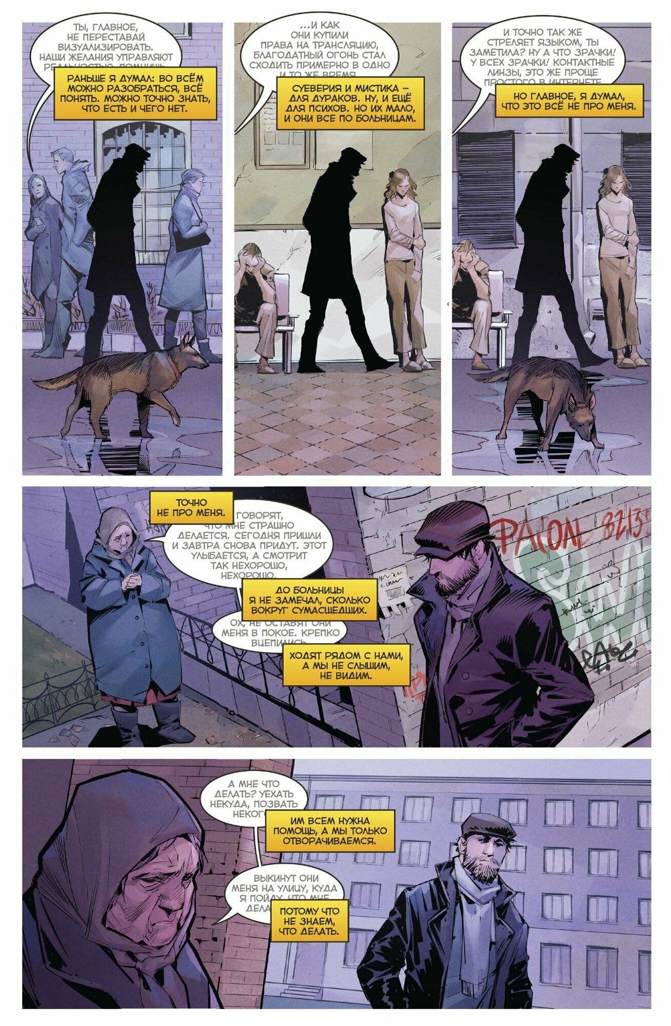 Если первая книга Майора Грома была бодрым детективным боевиком, то после перезапуска тон сбавился, атмосфера стала скорее нуарной: хмурый город, странные преступники, личностные проблемы главного героя. Действия мало, зато отлично отслеживается состояние Игоря Грома благодаря рисовке и палитре.
