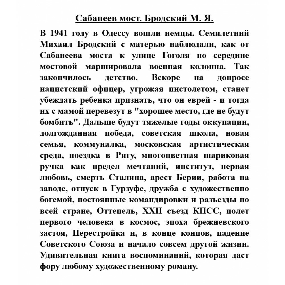 Я была просто очарована книгой «Сабанеев мост», тронута такими искренними воспоминаниями автора. За два дня чтения я познакомилась и, отчасти, подружилась сначала с одесским мальчиком, потом с юношей из Москвы, потом студентом, впоследствии инженером, да и просто интересным человеком. Михаил Бродский уверенно владеет словом, это видно мне, заядлой читательнице мемуаров, сразу. Жизнь разнообразна почти у каждого, но далеко не все могут рассказать о ней захватывающе. Автору это удалось. Ему выпало очень непростое, а в детстве, так и просто трагическое время. Тем не менее, он нашел место и для иронии, и для юмора, и для доброты в своей книге. Спасибо, Михаил, вы подарили мне (и всем, конечно) замечательное произведение.