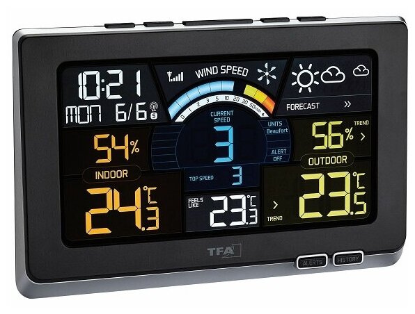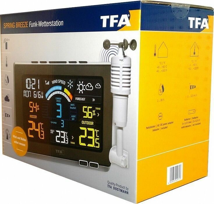 TFA Spring Breeze 35.1140.01 представляет собой цифровую метеостанцию с цветным LCD-дисплеем и выносным датчиком. Модель позволяет определять как температуру, давление и влажность внутри помещения, так и за его пределами. Также есть возможность определения скорости ветра благодаря наличию в датчике анемометра. Максимальная дистанция удаления датчика составляет 80 метров. Метеостанция имеет стильный дизайн и гармонично впишется в интерьер любого помещения.