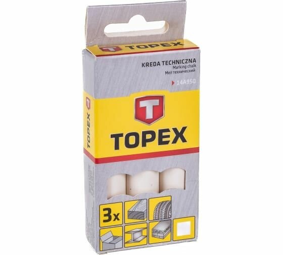 Мел разметочный TOPEX отличается уникальным химическим составом – что дает более прочный след, чем у обычного мела, благодаря этому разметка наносится легко и дольше сохраняется. Стойкость к высоким температурам позволяет маркировать элементы, предназначенные для сварки. Продукт имеет польский гигиенический сертификат и одобрение ассоциации астматиков и аллергиков, что является гарантией безопасности для каждого пользователя. Бренд TOPEX предназначен для домашних мастеров.