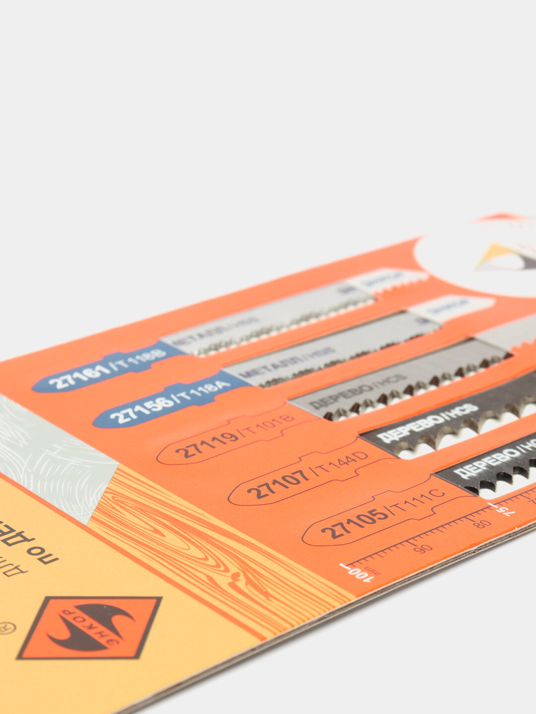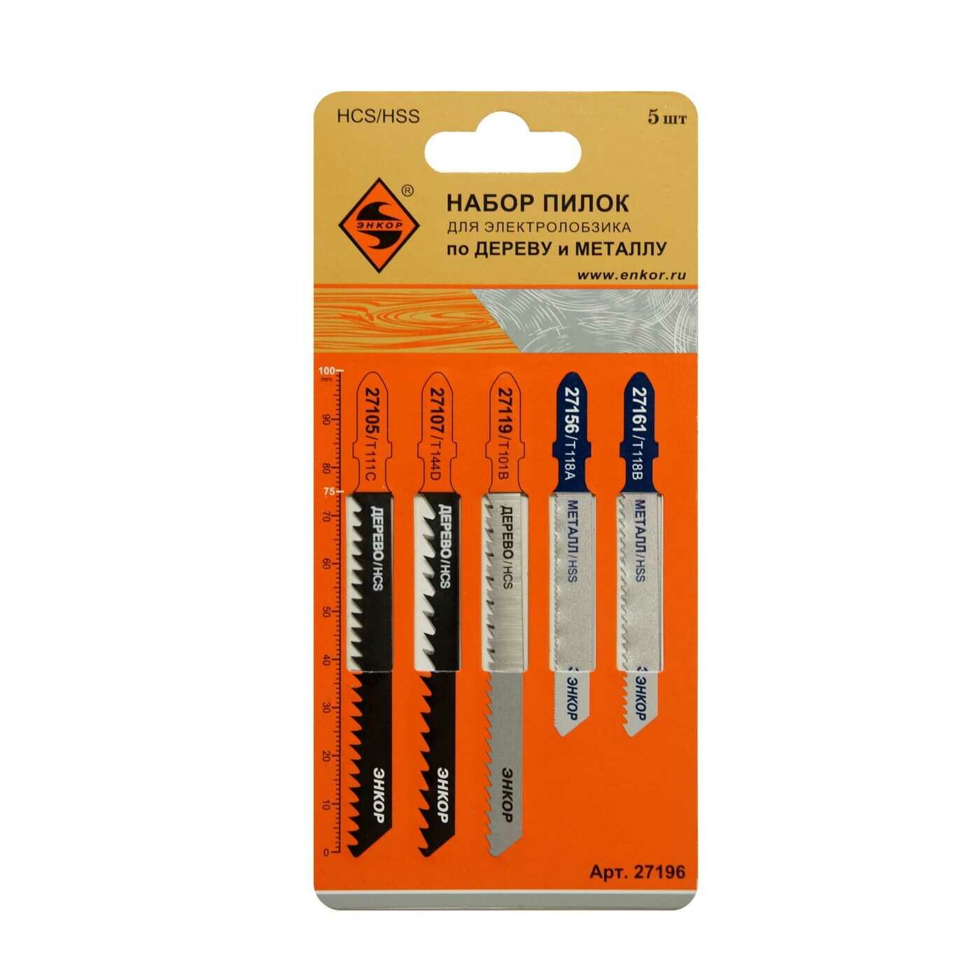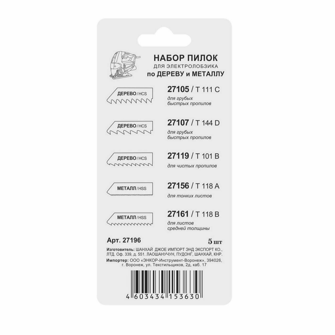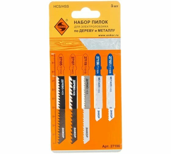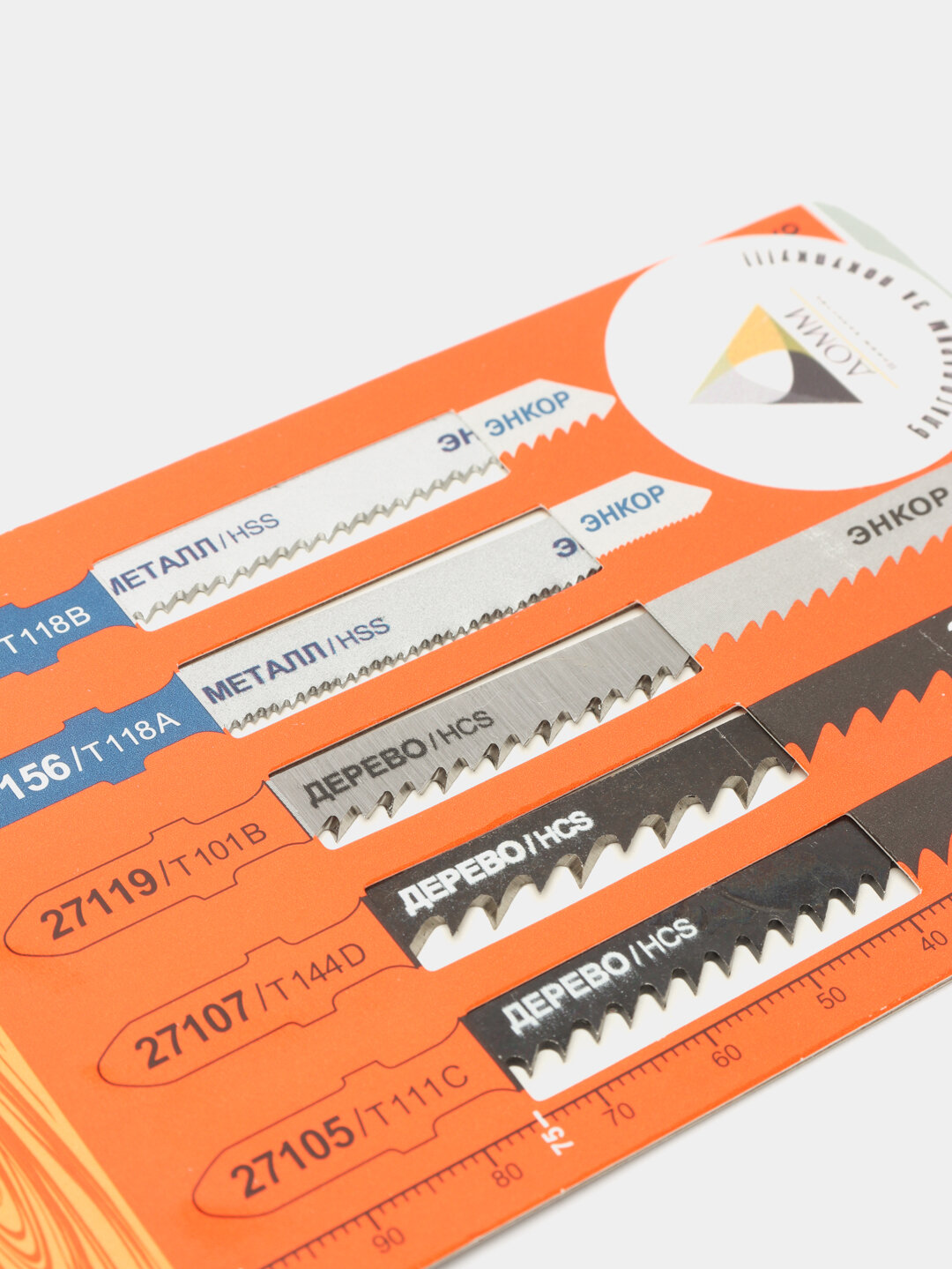 Набор пилок по дереву, 5 шт. Энкор Состав набора T119 BO, T101 AO, T244 D, T144 D, T101 BСостав набора Коды пилок T119 BOT101 AOT244 DT144 DT101 B 2710327117271092710727119И без того богатый ассортимент расходных материалов и оснастки к электроинструменту компании «Энкор» получил достойное пополнение - пилки для электролобзиков изготовленные в КНР под брендом «энкор», используя богатый многолетний опыт производства пилок под собственным брендом в Швейцарии на заводе Scintilla AG, г. Санкт-Никлаус (St. Niklaus), самым тщательным образом подошла к выбору производителя аналогичной продукции в Китае. Новые пилки «энкор», лучшие на рынке в соотношение цена качество, ни в чем не уступают аналогам европейского производства, а по отдельным критериям существенно превосходят их. Так же следует заметить, что производство пилок под брендом «энкор» в Швейцарии, будет продолжено. Все пилки «энкор» оснащены Т-образным хвостовиком с упором. Данный стандарт - самый распространённый в мире: 90% продаваемых сегодня пилок имеют именно такой хвостовик. При изготовлении пилок применяются самые современные технологии и материалы: высокоуглеродистые (HCS) и быстрорежущие (HSS) стальные материалы, а также их высокоэффективное сочетание - биметалл (BIM). Ассортимент пилок достаточно широк, тут есть из чего выбрать даже самому привередливому мастеру: помимо внешне стандартных полотен встречаются и весьма специфические, имеющие узкую специализацию. Модельный ряд покрывает, пожалуй, весь спектр задач при работе по мягкому и твердому дереву, фанере, ДСП, ДВП, столярным плитам: от быстрого и грубого пропила - до аккуратного пиления и криволинейных резов. Также в нем есть и пилки для металла. Пилки, произведенные в Швейцарии, поставляются в картонной коробке по 100 шт, пилки китайского производства упакованы в красочные информативные блистеры по 2 шт, наборы пилок предлагаются в упаковке по 5 шт. Данные форматы упаковки очень удобны для магазинов, торгующих профессиональной оснасткой к электроинструменту, так как предоставляют им максимально возможный выбор по презентации данных товаров и выкладке его на витрины.