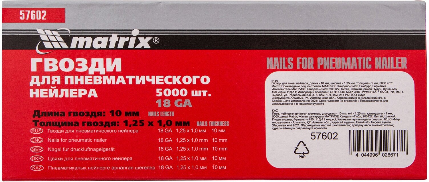 Гвозди MATRIX изготовлены из углеродистой стали и имеют никелированное покрытие. Они предназначены для крепления материала к поверхностям с помощью пневматического нейлера.