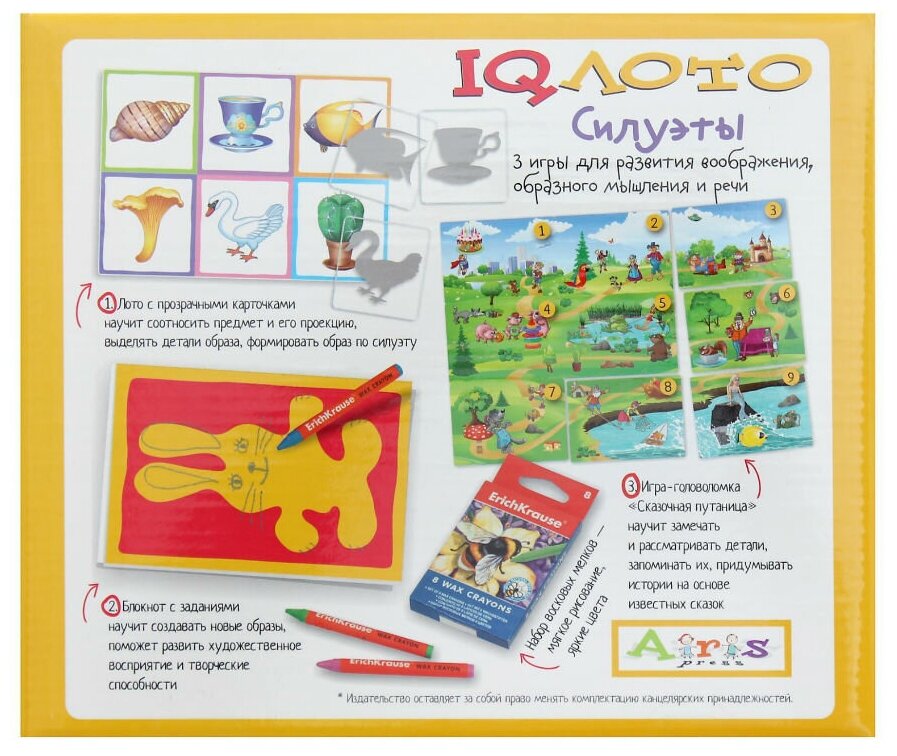 "Набор «Силуэты» – это комплект из трёх развивающих игр. В него входят: 9 картонных двухсторонних карт с рисунками, 54 прозрачные пластиковые карточки в мешочке, блокнот с творческими заданиями и набор цветных восковых мелков.Играя в интеллектуальное лото, ребёнок будет соотносить предмет и его проекцию, выделять детали образа, формировать образ по силуэту. Выполняя задания игры-головоломки, он учится замечать, рассматривать и запоминать детали, исправляет «ошибки» художника, фантазирует, придумывая истории на основе любимых сказок. Используя блокнот для творчества ребёнок создаёт новые образы, развивает художественное восприятие и творческие способности. Набор прекрасно подходит как для игры одного ребёнка, так и для работы с группой детей. Многофункциональность и удобство набора позволяют использовать его в детском саду, дома и на отдыхе.Набор предназначен для детей старше 4 лет. "