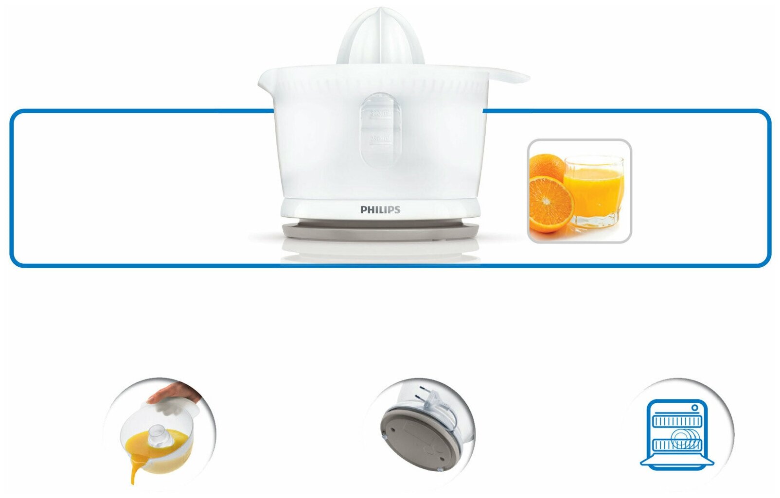 С помощью цитрус-пресса Philips можно легко приготовить вкусные соки дома. Благодаря компактной конструкции его легко хранить, а все части можно мыть в посудомоечной машине, что избавляет от мытья вручную и экономит время. Новая конструкция носика позволяет предотвратить проливание.