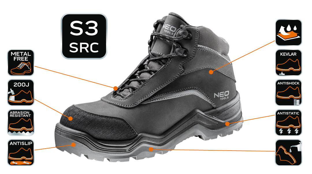 Ботинки рабочие мужские 82-151 NEO класса S3 SRC из нубука, защищают ногу от холода, промакания и впитывания воды. Обувь очень удобна, не содержит металлических элементов. Противоскользящая подошва с системой, поглощающей удары, устойчива к истиранию, маслам, бензину и другим органическим растворителям, подносок из стекловолокна выдерживающий удар до 200Дж. Рабочие полуботинки имеют многочисленные усилители и защиту от истирания, а также сертификат CE, соответствует стандарту EN: ISO 20345: 2011.