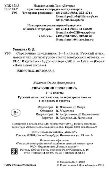 На сегодняшний день товар «Книга: Справочник школьника. 1-4 классы. Русский язык математика литературное чтение в вопросах и ответах (Ольга Дмитриевна Ушакова); Литера, 2021» можно купить с кешбеком в 5 магазинах: ЛитРес, Читай-город, book24, Яндекс.Маркет, Буквоед