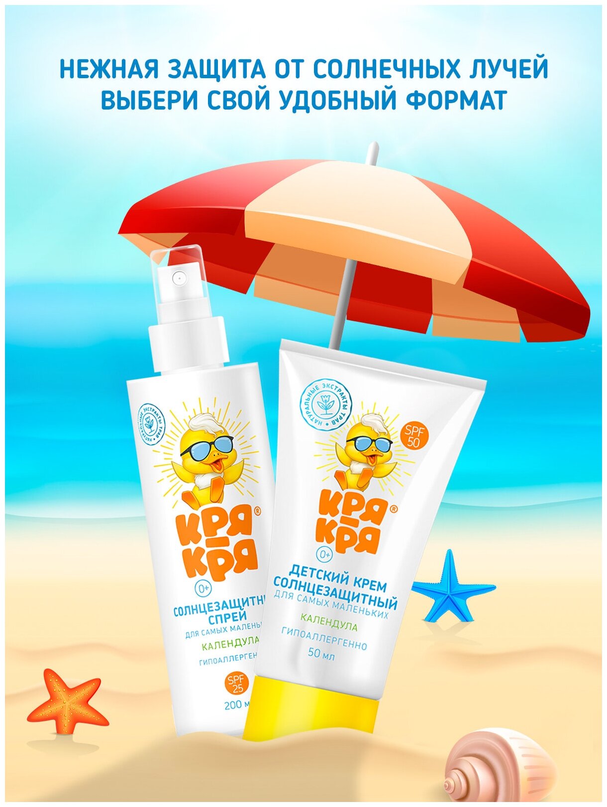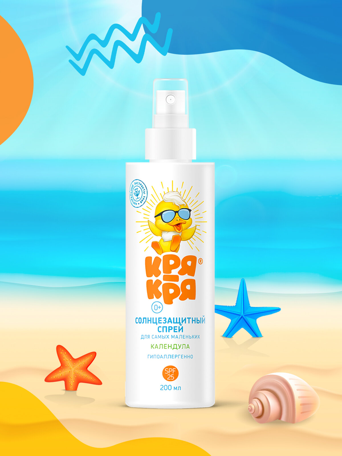 Солнцезащитный спрей Кря-Кря SPF 25 календула с рождения 200 мл. Солнцезащитный спрей «Кря-Кря»для защиты нежной кожи ребёнка. Спрей содержит комбинированный фильтр и защищающие компоненты. Алоэ-вера, витамин Е и Д-пантенол обладают противовоспалительным эффектом. Спрей хорошо распределяется по коже и защищает с первой минуты после нанесения.