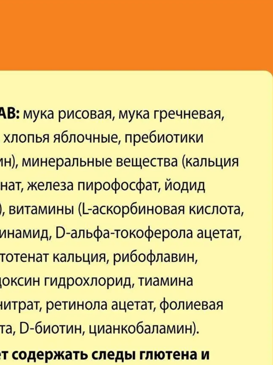 | Состав | Мука рисовая, мука гречневая, сахар, хлопья яблочные, пребиотики (инулин), минеральные вещества (кальция карбонат, железа пирофосфат, йодид калия), витамины (L-аскорбиновая кислота, никотинамид, D-альфа-токоферола ацетат, D-пантотенат кальция, рибофлавин, пиридоксин гидрохлорид, тиамина мононитрат, ретинола ацетат, фолиевая кислота, D-биотин, цианкобаламин). Может содержать следы глютена и молока. |