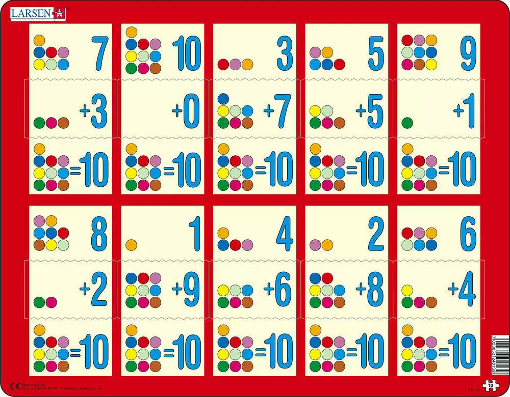 Пазлы Ларсен - это прежде всего обучающие пазлы. Пазл Сложение 1-10b относится к серии Математика и ориентирован на детей от 4 лет. Сам пример отпечатан на картоне, а детям необходимо найти правильный ответ. Данный пазл является прекрасным дополнением к Сложение 1-10а и Сложение 1-10b. Многообразие форм вырубки и различные размеры отдельных элементов способствуют развитию мелкой моторики у малышей. Сделанные из высококачественного трехслойного картона, они не деформируются и легко берутся в руки. Все пазлы снабжены специальной подложкой, благодаря чему их удобно собирать.