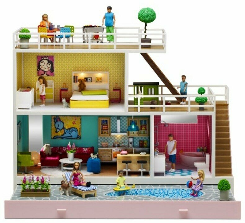 Lundby Кукольный домик Стокгольм с выдвигающимся бассейном с подключением света. Шведская компания Lundby – одна из старейших в мире по производству кукольных домиков. Ее история началась в далеком 1945 году, когда супруги Томсен открыли семейное предприятие в родном городе Lundby Лундбю. Со временем производство значительно расширилось, а игрушки компании Lundby завоевали сердца покупателей во всем мире. Кукольные домики Lundby – это уменьшенные копии современных домов в масштабе 1:18. Серия Смолэнд – это основа, которую можно заполнить мебелью и деталями интерьера на свой собственный вкус: приобрести новый комплект мебели, поменять обои, повесить шторы. Также есть возможность расширить игровое пространство, достроив дополнительный этаж. Отдельно можно приобрести уличную зону в зимнем и летнем варианте. Серия Стокгольм – это домик с элементами внешнего дизайна: верхней площадкой для барбекю, внутренним двориком и шикарным выдвижным бассейном. Разумеется, этот домик тоже можно обставить и украсить на свой вкус. Уникальная особенность домиков Lundby – возможность подключения настоящего освещения в комнатах! Эта опция приводит в восторг даже родителей, что уж говорить о детях. При этом оборудование полностью безопасно, что очень важно, когда речь идет о детских игрушках. Освещение подключается очень легко: внутри домика имеется вся необходимая проводка – нужно просто установить светильники и подключить к питанию можно подключить до 36 единиц различного света. Элементы освещения и блок питания продаются отдельно в наборах. Мебель и детали интерьера выполнены с большим вниманием к деталям, выглядят очень достоверно и гармонируют между собой. Чтобы поменять обои в домике, нужно скачать их с сайта компании в pdf-формате, распечатать на цветном принтере, вырезать и наклеить. Двухэтажный современный дом для кукол из серии Стокгольм от шведской компании Lundby. Оснащен электрической разводкой для подключения светильников сами светильники и блок питания приобретаются отдельно. Внутри 3 отдельных помещения, на крыше площадка для барбекю, есть открытая терраса и шикарный выдвижной бассейн. Элементы мебели и декора, а также фигурки обитателей в комплект не входят.